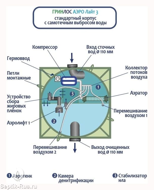 Септик Гринлос Аэро Лайт 3 изготавливается из первичного полипропилена. Корпус разделен на четыре отсека со специальными технологическими переливами. Перетекая из одной камеры в другую, стоки последовательно проходят процессы усреднения, аэрации, отстаивания, нитрификации и денитрификации, осветления, после чего выводятся в грунт принудительным или самотечным способом.